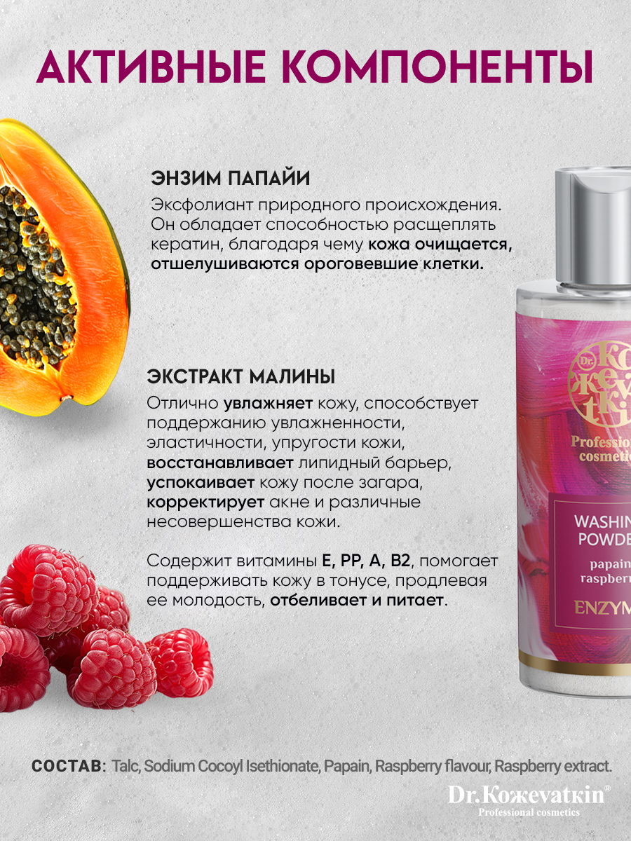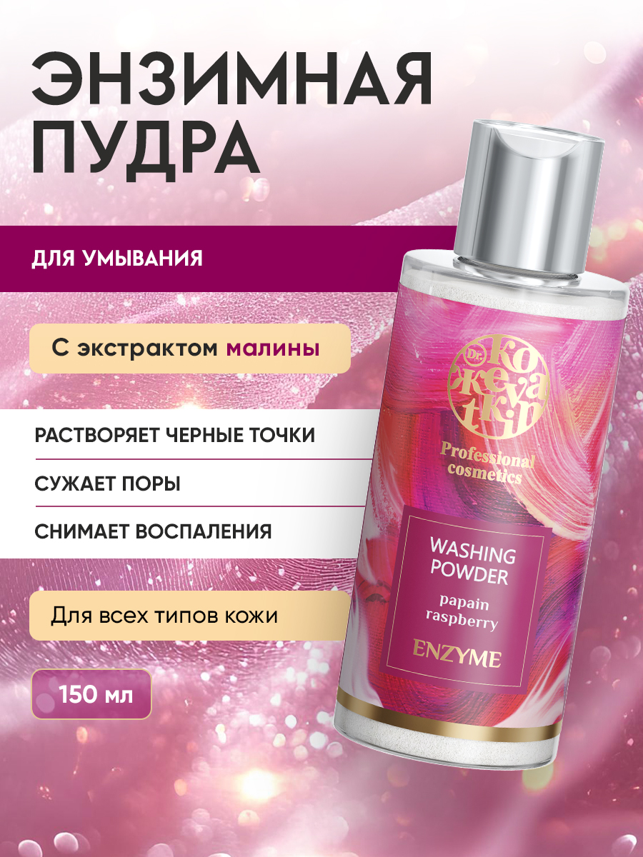 Энзимная пудра для умывания с экстрактом малины, 150 мл. Очищение, себорегулирование, повышение эластичности кожи.