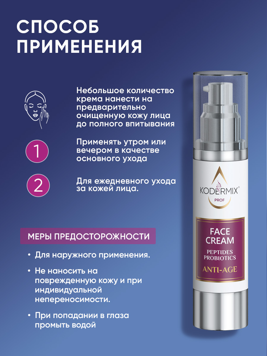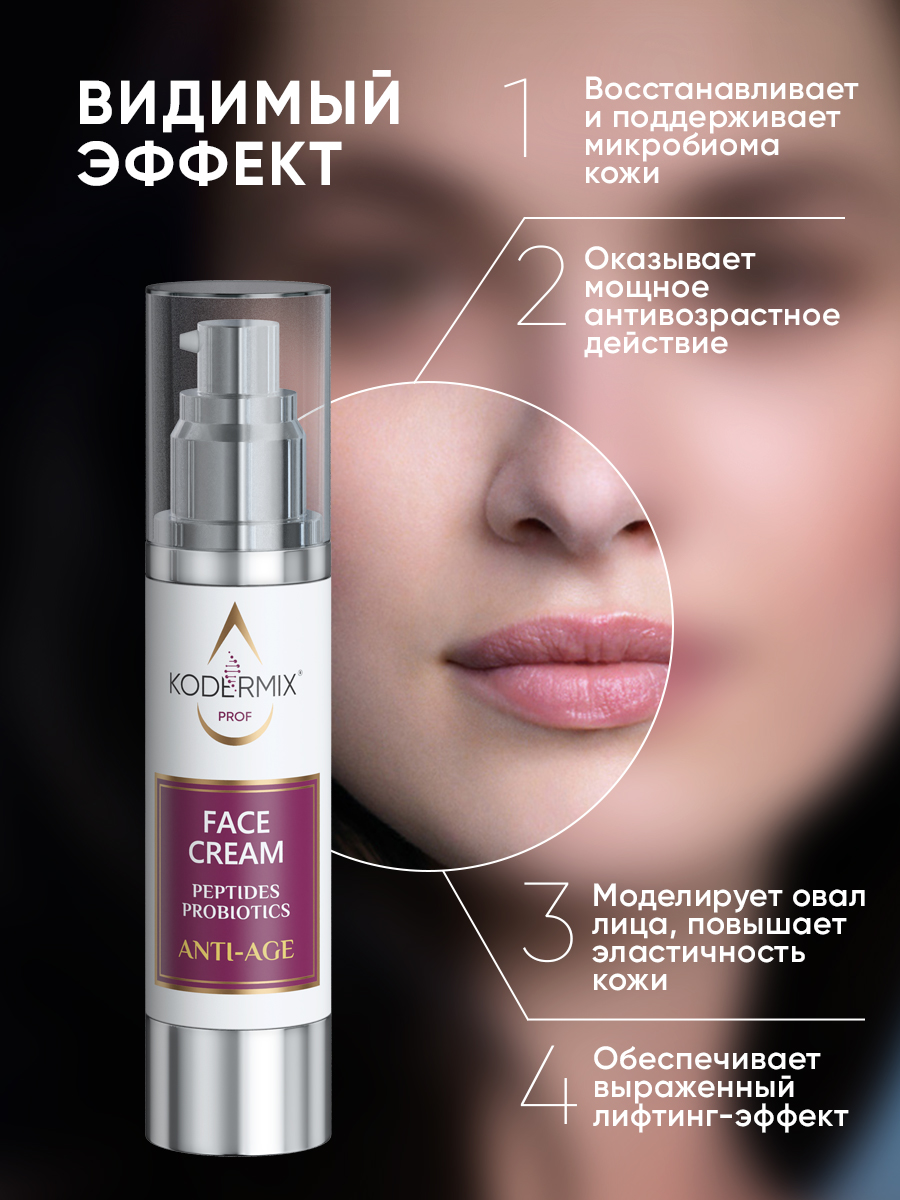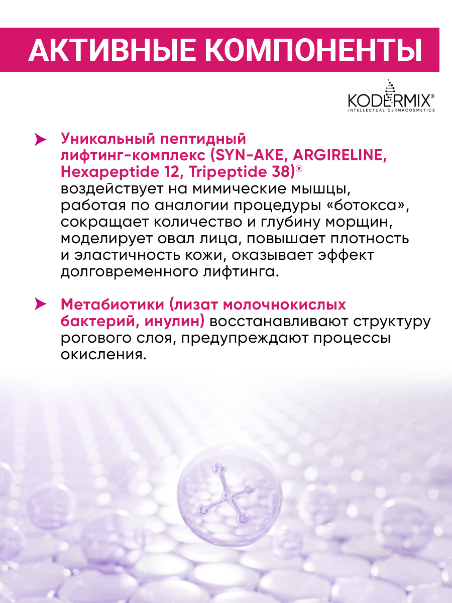 Крем лёгкой гелевой текстуры с высокой концентрацией инновационных активов предназначен для помощи «уставшей», увядающей коже: обеспечивает видимый лифтинг-эффект, оказывает мощное антивозрастное действие, возвращает молодость. Уникальные пептиды SYN-AKE и ARGIRELINE комплексно воздействует на мимические мышцы, работая по аналогии процедуры «ботокса». Сокращают количество и глубину морщин, моделируют овал лица, повышают эластичность кожи. Сигнальные пептиды Hexapeptide 12, Tripeptide 38 клинически доказанно стимулируют выработку коллагена, эластина во всех слоях кожи, оказывая накопительный и долговременный регенерирующий эффект, повышают плотность и упругость дермы. Инулин и лизат молочнокислых бактерий способствуют восстановлению естественной экосистемы и поддержанию здорового микробиома кожи, стимулируют местный иммунитет, делая кожу устойчивой к стрессам, воспалению и старению.