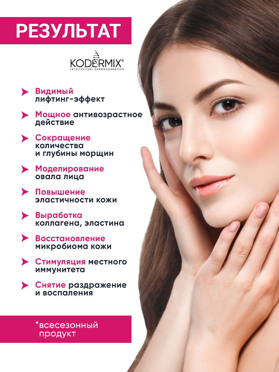Интеллектуальная дермакосметика Kodermix® разработана экспертами нашей компании благодаря инновационным открытиям в области дерматологии и генокосметики. В своём составе она содержит уникальный кодер-комплекс КoderMIX™ - мощный источник биомиметической энергии кожи, адаптируется к имеющимся анатомическим структурам, создавая убедительный видимый результат.