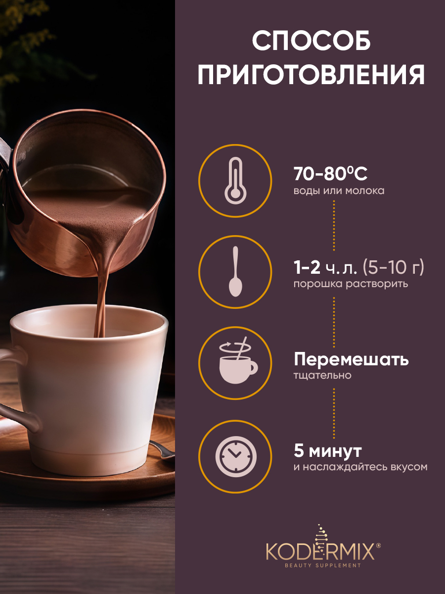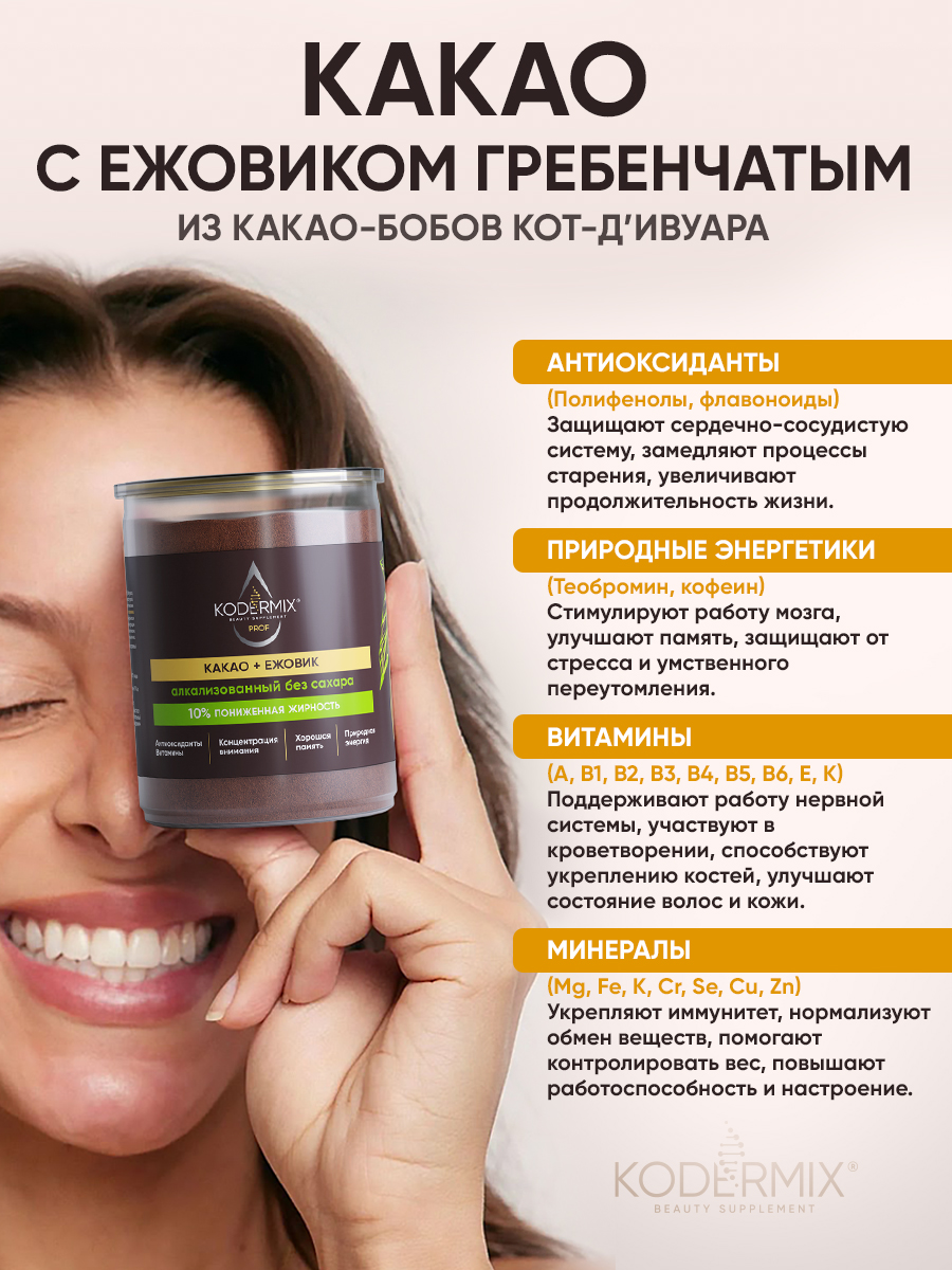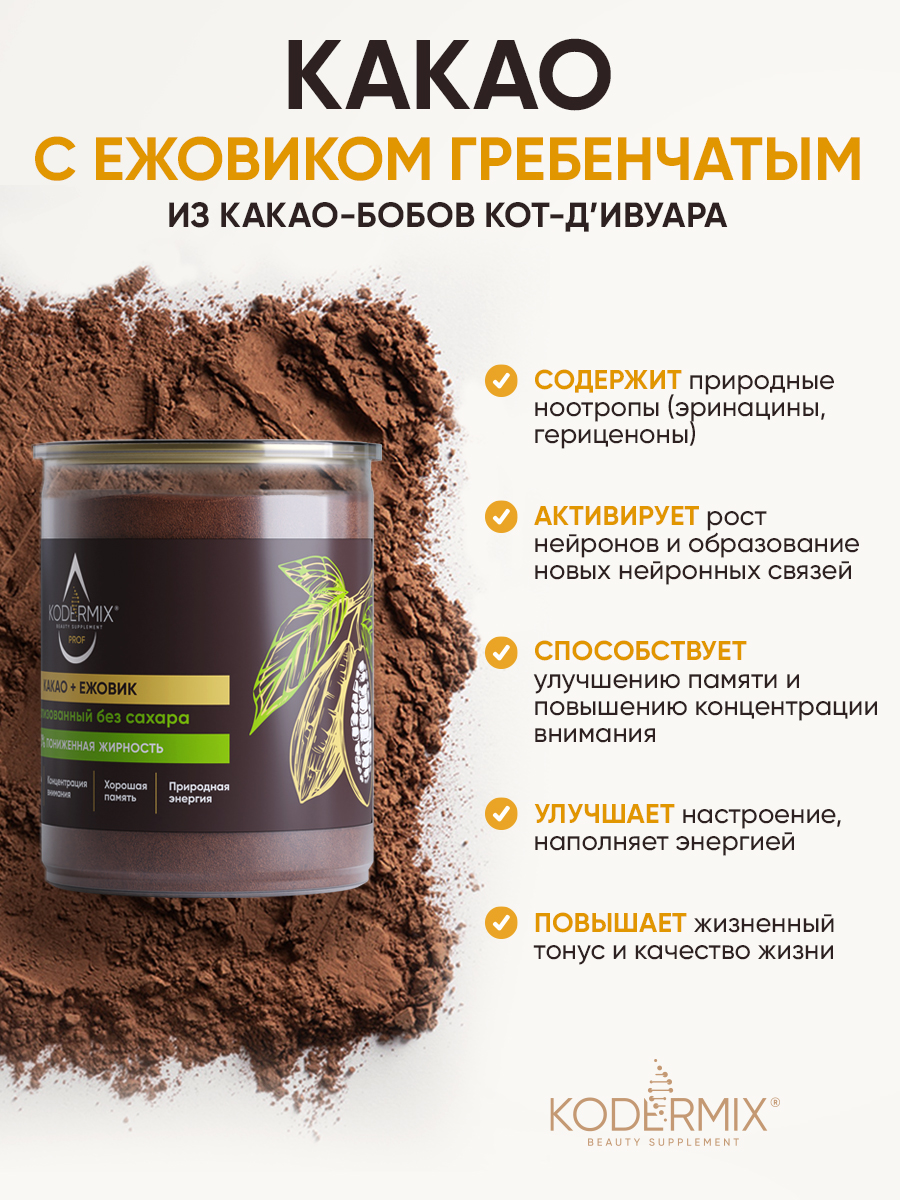 Какао-порошок богат антиоксидантами (полифенолы, флавоноиды), природными энергетиками (теобромин, кофеин), витаминами (А, В, Е), минералами (Mg, Fe, K, Cr), клетчаткой. Экстракт ежовика гребенчатого содержит природные ноотропы (эринацины, гериценоны) активирует рост нейронов и образование новых нейронных связей, способствует улучшению памяти и повышению концентрации внимания. Какао улучшит настроение, наполнит энергией, повысит жизненный тонус и качество жизни. Подходит для здорового питания. Вкусное и полезное дополнение к мороженому, десертам и выпечке.