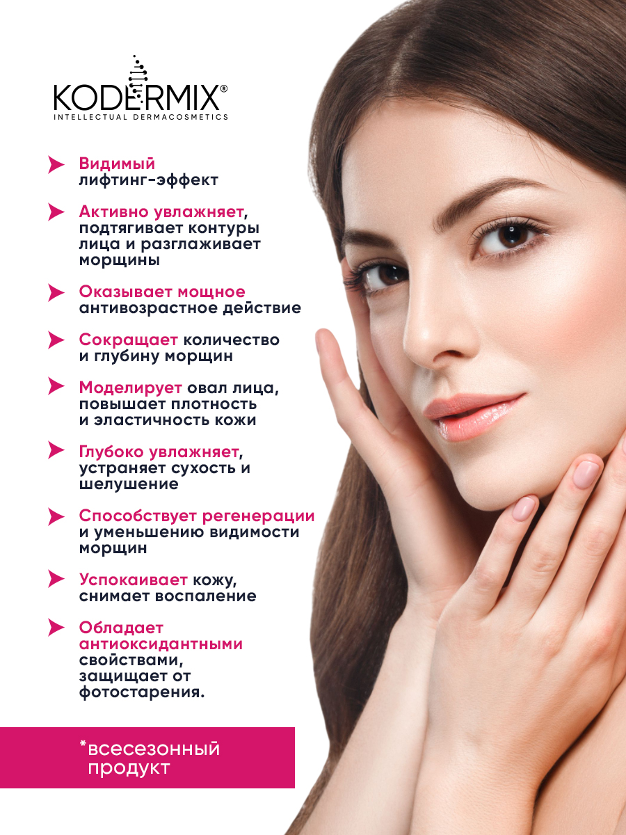 Интеллектуальная дермакосметика Kodermix® разработана экспертами нашей компании благодаря инновационным открытиям в области дерматологии и генокосметики. В своём составе она содержит уникальный кодер-комплекс КoderMIX™ - мощный источник биомиметической энергии кожи, адаптируется к имеющимся анатомическим структурам, создавая убедительный видимый результат.