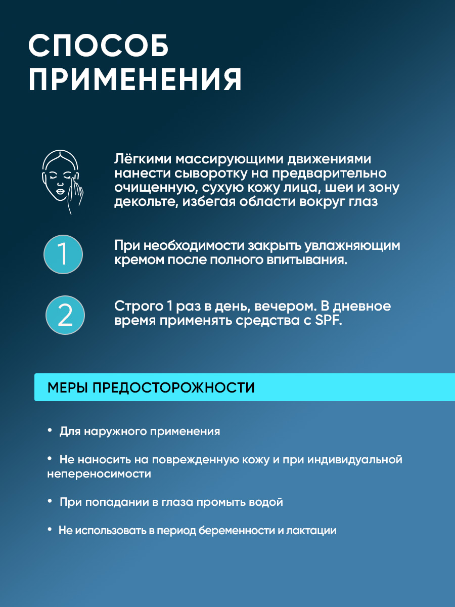 РЕКОМЕНДАЦИИ ПО ПРИМЕНЕНИЮ: лёгкими массирующими движениями нанести сыворотку на предварительно очищенную, сухую кожу лица, шеи и зону декольте, избегая области вокруг глаз, строго 1 раз в день, вечером. При необходимости закрыть увлажняющим кремом после полного впитывания. В дневное время применять средства с SPF.