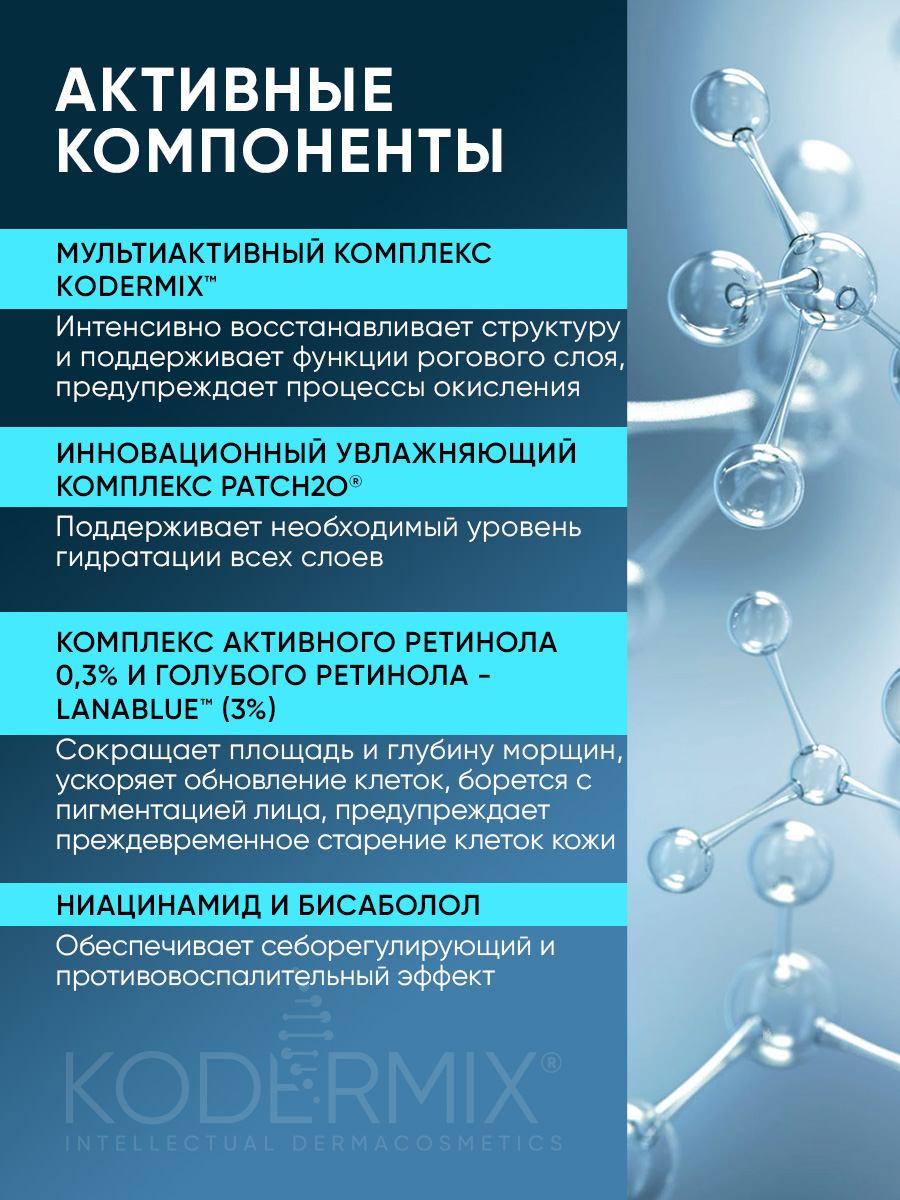 Сыворотка содержит комплекс активного ретинола 0,3% и голубого ретинола - Lanablue™ (3%) – растительный аналог. Эффективно справляется со всеми признаками возрастных изменений:сокращает площадь и глубину морщин, повышает упругость и тонус кожи, ускоряет обновление клеток и борется с тусклым цветом, пигментацией лица, предупреждает преждевременное старение клеток кожи. Увлажняющий комплекс PatcH2O® обеспечивает пролонгированную (до 5 дней) гидратацию всех слоев эпидермиса. Мультиактивный комплекс КoderMIX™ интенсивно восстанавливает структуру и поддерживает функции рогового слоя, предупреждает процессы окисления. Ниацинамид и бисаболол обеспечивает себорегулирующий и противовоспалительный эффект.